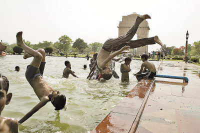 4月29日,在印度首都新德里印度门纪念碑附近,一群孩子在水池里玩耍。印度北方近期持续高温,拉贾斯坦邦气温飙升至45摄氏度,首都新德里也高达42.4摄氏度。新华社/法新