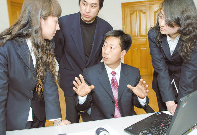 农民工黄宝平(右二)和工会干部一起研究工作(4月30日摄)。原做装卸工的黄宝平现已成为天津港益港劳务公司工会干部。目前,天津港建设大军中有8000余名农民工,他们在天津港倡导“发展港口、成就个人”的企业文化氛围中抓住机遇,学知识、学技能、爱岗敬业、吃苦耐劳,已把自己与港口融为一体,成为港口的新型产业工人。新华社记者刘海峰摄