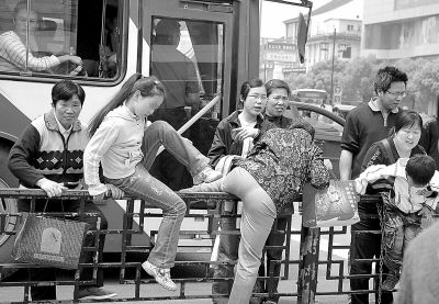 5月1日,在苏州市观前街,一些行人在过马路时跨越隔离栏。“五一”黄金周首日,苏州闹市观前街人流不息。一些行人在过马路时不走地下通道,而是翻越隔离栏,与机动车抢道。这种行为既不文明,又容易造成交通事故。新华社发