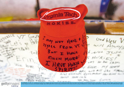 5月11日,美国弗吉尼亚理工大学的操场上放置着一个棒球帽,写有怀念的语句。枪击案三周之后,这里仍然笼罩着悲伤的气氛。第二天,大概有4000名学生在学校领到毕业证书,开始他们新的旅程。盖蒂摄