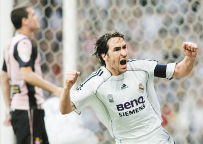 5月13日,西甲级联赛第34轮的一场焦点战中,皇马在主场以4∶3逆转战胜西班牙人队,取得4连胜。皇马因此登上了西甲榜首。图为皇马球星劳尔在打进扳平的一球后近乎疯狂的庆祝。肖艾摄