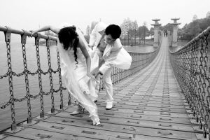 2007 年4 月15日,湖北武汉东湖落雁景区。一对新人在索桥上拍结婚照,新娘险些被婚纱绊倒。
