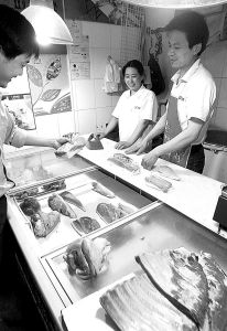 5月22日,顾客在上海市长宁路上的肉类零售网点选购猪肉。目前,上海市猪肉的批发价已高达每公斤16元,比4月上涨15%。