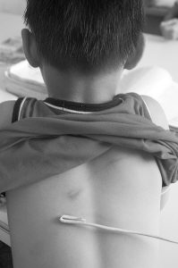 在海口市坡博村,有一所以外来工子女为主要教学对象的春风学校。5月25日,发生了一件让一位姓蔡的家长难以接受的事情。这天,他10岁的儿子高高兴兴地去上学了,没想到,中午放学回到家后,儿子后背竟然有一条长约10厘米的伤痕。儿子不敢声张,并拒绝上学。经询问,儿子才说出实情,伤痕是班主任用外包胶皮的铁衣架做的教鞭抽打的。