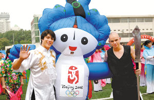 5月26日,某武术学校的两名外籍学员与充气福娃合影。当天,“全民健身与奥运同行·2007年河南省全民健身周”在郑州市体育场开幕,会上提出了“每天健身一小时、幸福生活一辈子”的号召。