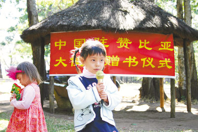 5月27日,赞比亚中文学校的儿童在捐赠仪式上表演节目。“六一”国际儿童节来临之际,中国驻赞比亚使馆在位于赞比亚首都卢萨卡郊区的蒙达旺加植物园内向当地中文学校捐赠书籍,使馆工作人员与学生家长们还一起观看了学生们表演的节目。新华社记者石寿河摄
