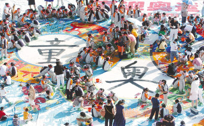 5月28日,小学生们在画布上创作。当日,“喜迎奥运,放飞梦想”绘画庆“六一”活动在太原市的山西现代双语学校举行,2008名小学生在近800平方米的画布上创作出“童心盼奥运”巨幅彩画,以此表达对2008年奥运会的期盼和支持。新华社记者江宏景摄