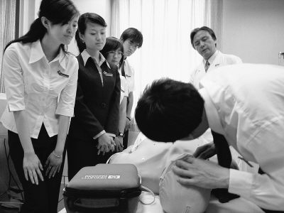 5月26日上午,北京大学第三医院主任医师郑亚安一边讲解急救要领,一边示范。在他身旁,围着一圈身着正装,凝神观摩的青年,他们是首都大学生新世纪英才学校因备战北京奥运会而招收的奥运会骨干志愿者学员。