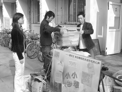 照片:北京师范大学赛扶协会的同学正在校园里募捐。他们将募集到的图书和其他物品在SUNACT跳蚤市场进行义卖,所得资金全部用来帮扶失足青少年。祝乐群摄