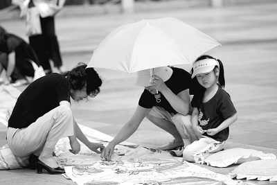 5月30日,江苏省南通市环西文化广场,一幼儿园举办的幼儿绘画才艺展示活动中,不少家长心疼孩子辛苦,替孩子作画。一名幼儿教师表示,放手让孩子描绘、展示,才是活动的初衷,但不少作品最后都成了家长的作品。CFP供稿
