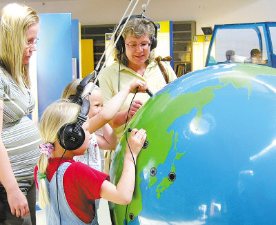 5月27日,在芬兰首都赫尔辛基市附近的赫尤里卡科学中心主展厅的地球仪旁,芬兰儿童头带耳机,将耳机插头插在地球仪不同的地区,可以听到世界各地60种语言的问候。赫尤里卡科学中心是一个深受芬兰儿童欢迎的科技馆。它通过其设计新颖、富有哲理的展品对儿童进行深入浅出、寓教于乐的科普教育,激发他们对科学的兴趣。
