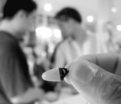 图:有关人员展示查获的高考作弊器,微型耳机很难被人察觉。崔健摄(新华社发)