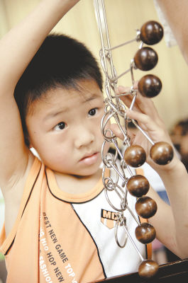 6月1日,在湖北省襄樊科技馆举行的中国古典益智玩具科普展上,一个孩子好奇地把玩古典益智玩具九连环。
