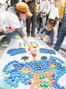 6月3日,一个小朋友在环保志愿者的指导下用瓶盖粘拼“福娃”。