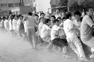 6月2日,湖北省襄樊市第五中学的学校操场上呐喊声此起彼伏,该校高三年级的全体师生开展班级拔河、抱球接力赛,放松心情,迎接高考。