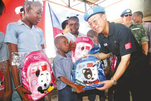 6月1日,在海地首都太子港太阳城国立学校,中国驻海地维和警察防暴队队员向该校学生赠送印有五星红旗的书包。当天,中国驻海地维和警察防暴队向海地太子港太阳城国立学校赠送了文体用品及食品,并与海地儿童共度六一国际儿童节。
