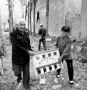 6月2日,河南省永城市侯岭乡盛弯村的村民和施工人员一起抬着电气设备,为村里通电的事情忙前忙后。