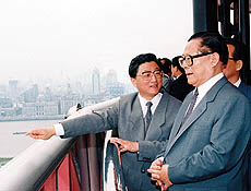 ▲一九九五年五月十七日,江泽民在时任上海市委书记的黄菊陪同下视察上海浦东新区。 |