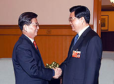 | ▲二○○七年三月五日,十届全国人大五次会议在北京开幕。这是大会前,胡锦涛同黄菊亲切交谈。 |