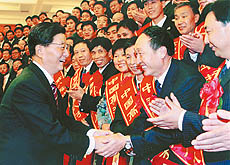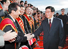 ▲2005年10月15日,青藏铁路全线铺通庆祝大会在拉萨火车站举行。这是黄菊在拉萨火车站同参加青藏铁路建设的劳动模范和先进工作者亲切握手。 |