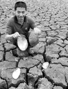 |        村民姚仕川在四川资中县五四村一片已脱水干裂的鱼塘里手持干死的河蚌壳诉说旱情之重。    继2006年遭受特大旱灾之后,四川又遭遇严重冬干、春旱连夏旱,目前全省有46个县(市、区)的夏旱持续发展,给旱区群众的生产、生活造成严重影响。全省有398.8万人、446万头牲畜因旱发生饮水困难,有11.6万人靠送水解决生活用水;旱区水稻栽插严重受阻,至今仍有大面积水稻无水栽插;已栽播的水稻、玉米等农作物因旱生长受阻,严重的甚至已经干枯。    新华社记者 杨三军摄     |