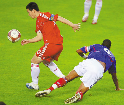 照片:6月10日,在法国举行的2007年土伦杯决赛中,中国国奥队虽然以1∶3不敌法国队获得亚军,但仍创造了中国队参加该赛事的最佳战绩。图为国奥队陈涛(左)带球突破。国新摄