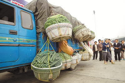 6月10日拍摄的被查处的农用三轮车。当日,一辆运送蔬菜的农用三轮车在通过安徽芜湖长江大桥时,被交警查扣。该车狭小的车厢内挤了18人,车外挂满装有蔬菜的大筐。涂志勤摄(新华社发)