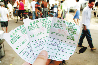 6月12日,在海南省定安县解放路上,“私彩”摊贩出售彩票。该县最繁华的解放路及附近农贸市场,聚集了几十家“私彩”摊贩。“私彩”泛滥屡禁不绝,其中一个重要原因是当地对“私彩”打击的行政管理仍然缺位。新华社记者赵颖全摄