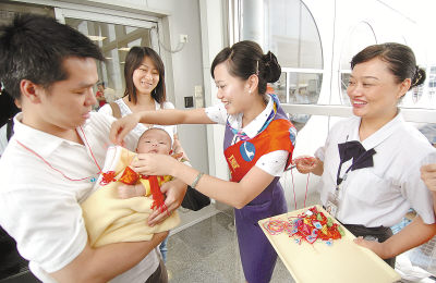 6月15日,在厦门高崎国际机场登机口,台胞萧政夫(左)一家接受厦航工作人员赠送的吉祥如意香囊。当日13时,156名台胞乘坐厦航两岸端午包机MF881航班从厦门飞往台北过节。新华社记者姜克红摄