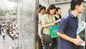 6月17日上午,来自四川各地的高考学生和家长在咨询现场外面的大街上排起长队等待分批入场。当日,全国100多所大中专院校在成都为高考生和家长提供志愿填报和择校咨询服务。