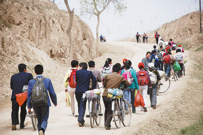 照片:这是新庄中学学生回家必经的山路。家离学校5里路以上的学生,只有周末才能回家。无论在生活中还是在学业上,他们都已习惯在崎岖的道路上攀登。本报记者狄多华摄