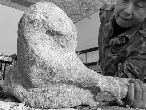 发掘队在裸露化石周围打了一些探测的钻孔,将周围岩层剥离开,查看下面是否有化石。没有,就缩小范围再打一些钻孔,再剥离岩层。如此反复试探,最后确定化石散布在大约七八平方米的范围内。“看来是个大家伙。”工作人员随即将整个岩层连同化石切割下来,用石膏和麻袋包好,打成包裹带回实验室慢慢剥离。这种包裹有个专业名词——皮套克。因为化石体积庞大,不得不做成几个“皮套克”才能运走。