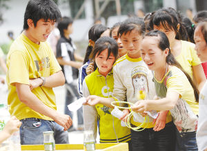 湖南省吉首市马颈坳中学的学生和来自香港的支教老师陈乐文(左一)一起参加学校游园会游戏(6月21日摄)。2006年9月,参加“香港大学生内地支教计划”的10名香港大学生来到湘西,在吉首市山区的矮寨中学、马颈坳中学、河溪中学三所学校支教一年。近一年时间里,这些志愿者入乡随俗,不仅适应了湘西大山的生活,也把互动、平等的教育理念带到这里。短短10个月,他们进行了近千次家访,组织了丰富的课外活动,和大山里的孩子建立起深厚的感情。新华社记者李尕摄