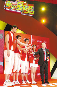 |        7月3日,距离2008年北京奥运会开幕还有402天之际,可口可乐公司揭晓规模空前的“奥运星阵容”,其中包括姚明、刘翔、郭晶晶、王励勤、易建联和赵蕊蕊等当今中国的杰出运动员。    此外,还有中国男篮、中国女排、中国男女跳水队、中国男女体操队和中国男女田径队等梦幻团队。当日奥运火炬手提名活动也在全国范围内正式启动,姚明、赵蕊蕊、王励勤和郭晶晶(从左至右)率先被提名为奥运火炬手人选。    图为中国篮球运动员姚明、排球运动员赵蕊蕊、乒乓球运动员王励勤、跳水运动员郭晶晶和可口可乐奥林匹克项目总经理鲁大卫(从左至右)在北京举行的可口可乐“奥运星阵容”揭幕仪式上。 本报记者 刘占坤摄     |