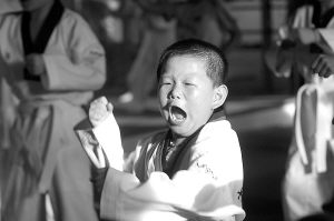 一名学龄前儿童正在练习跆拳道。江苏扬州中小学生已经开始了暑假生活,暑期免费跆拳道培训班受到孩子们的欢迎。 赵军摄