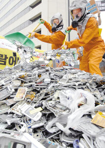 7月3日,在韩国首都首尔情报通信部前,环保主义者用铲子翻转废弃的手机。当日,韩国环保主义者举行活动,要求对废弃手机进行妥善处理。 新华社/法新