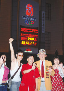 7月4日晚,几名北京市民在中国国家博物馆门前的2008年奥运会倒计时牌前留影。当晚8时整,中国国家博物馆门前的2008年奥运会倒计时牌显示,距北京奥运会开幕还有400天。 新华社记者 罗晓光摄