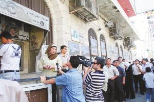 7月4日,巴勒斯坦公务员在约旦河西岸城市拉姆安拉街头的提款机前排队等待领取6月份的足额工资,这是巴公务员近17个月以来首次领取足额工资。巴紧急政府当天起开始向约旦河西岸和加沙的近14万名公务员发放6月份的足额工资,并承诺在1周内补发以前拖欠工资的三分之一。