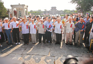 在北京卢沟桥,当年参加抗战的老兵行军礼向牺牲的战友致敬。7月7日,9位参加“七七事变”抗战的老兵以及部分老兵家属,聚集在北京卢沟桥,参加在此举办的纪念中国人民抗日战争全面爆发70周年活动。本报记者陈剑摄