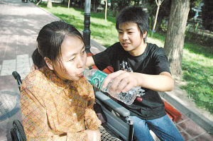 照片:7月8日,张晓在给母亲喂水。新华社记者屠国玺摄