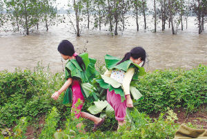 7月15日,安徽凤阳县黄湾乡韩巷村淮河大堤上,两位全身用荷叶打扮起来的小姑娘无拘无束地玩耍着。她们面前的淮河水仍在不断上涨。