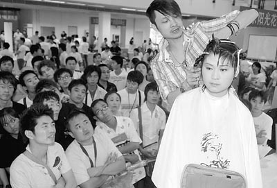 7月18日,北京国展中心,造型设计师现场修剪时尚发型。当天,第13届中国国际美发美容节开幕。本届美发美容节涵盖了美容、美发、表演、科技、论坛、展会、商务等多项主题活动,不仅有美容、美发、美体、美甲最新的产品集中亮相,还将举行中国国际美发美容用品博览会、世界杯发型化妆美甲大赛亚洲区公开赛、中国国际化妆艺术邀请赛等活动。 赵晶摄