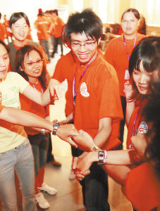 ▲7月12日,台湾学生与北京大学生一起完成智力游戏“解扣”。本报记者 郑萍萍摄