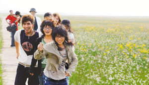 ▲河北省沽源县五花草甸让台湾青年流连忘返。本报记者 许海涛摄