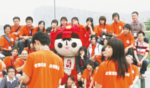 ▲北京“鸟巢”工地前,台湾学生争相和奥运福娃合影留念。初次见到和真人大小的奥运会吉祥物,大家都兴奋不已。本报记者