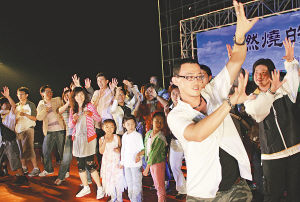 ▲7月14日晚,两岸青年在张北县中都草原度假村围起篝火跳舞。实习生 苏丹摄