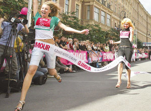 7月21日,在俄罗斯的圣彼得堡,参加高跟鞋赛跑的选手冲过终点线。当天,约100名女孩参加了这次比赛。参赛选手所穿高跟鞋的鞋跟不得低于9厘米,比赛的奖品是一张价值5万卢布(约合2000美元)的购物券。新华社/法新