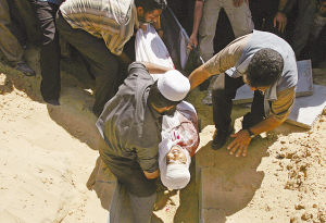7月22日,在加沙地带北部的拜特拉希亚,人们将一名被以色列军打死的巴勒斯坦伊斯兰抵抗运动(哈马斯)武装分子埋葬。据法新社统计,自2000年9月以来,已有5790人在巴以冲突中丧生,其中大部分为巴勒斯坦人。新华社/法新