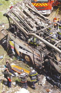 7月22日,救援人员在法国东部城市格勒诺布尔附近查看车祸中被毁的车辆。一辆满载波兰朝圣者的客车当天在阿尔卑斯山区第85号国家公路距法国东部城市格勒诺布尔约30公里的地段发生翻车事故并坠入山谷,造成至少20人死亡。新华社/法新