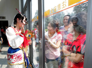 7月21日,“卡酷全卡通”动漫嘉年华在北京农展馆开幕。在COSPLAY表演区兼展区主表演台,动漫迷们拿着相机和摄像机四周猛拍。在表演区的后台正好有一个玻璃大门,一些机灵的动漫迷透过这扇门“近距离”观赏自己的COSPLAY偶像。虽在门外,还是有热情的粉丝拍着门吸引偶像的注意力。杨威摄